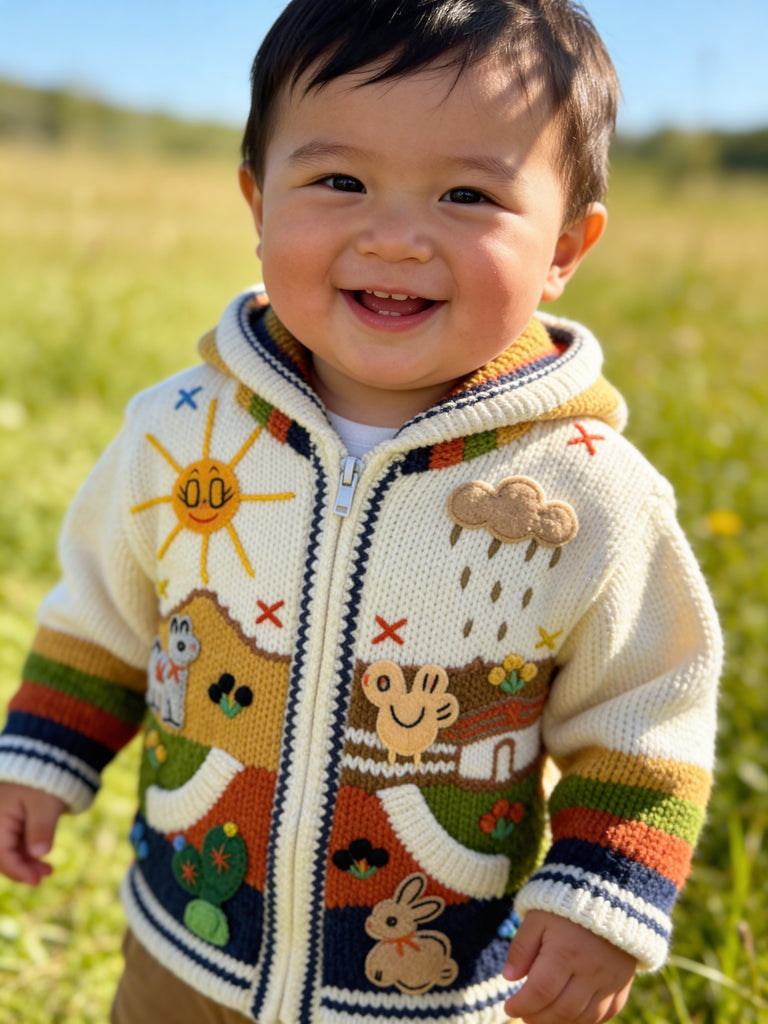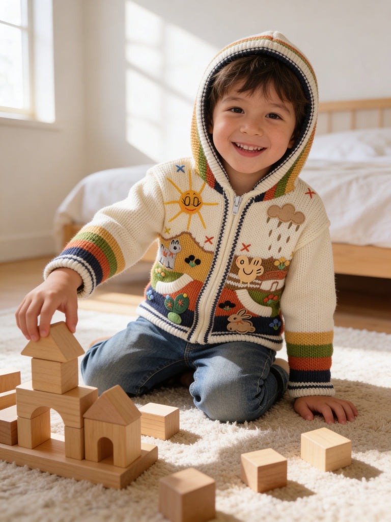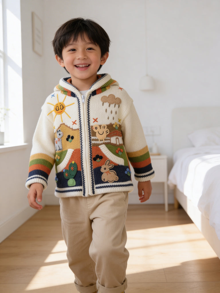 Hand-embroidered in the highlands of Peru, the Storybook Sweater brings to life whimsical scenes of animals, flowers, and forest magic — each one stitched by hand with vibrant detail and imagination. Soft, cozy, and full of personality, it’s a wearable tale your little one will love to live in.