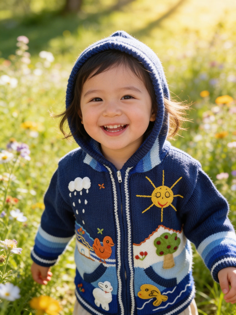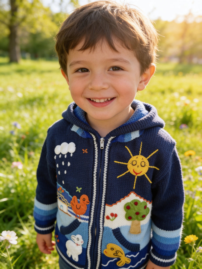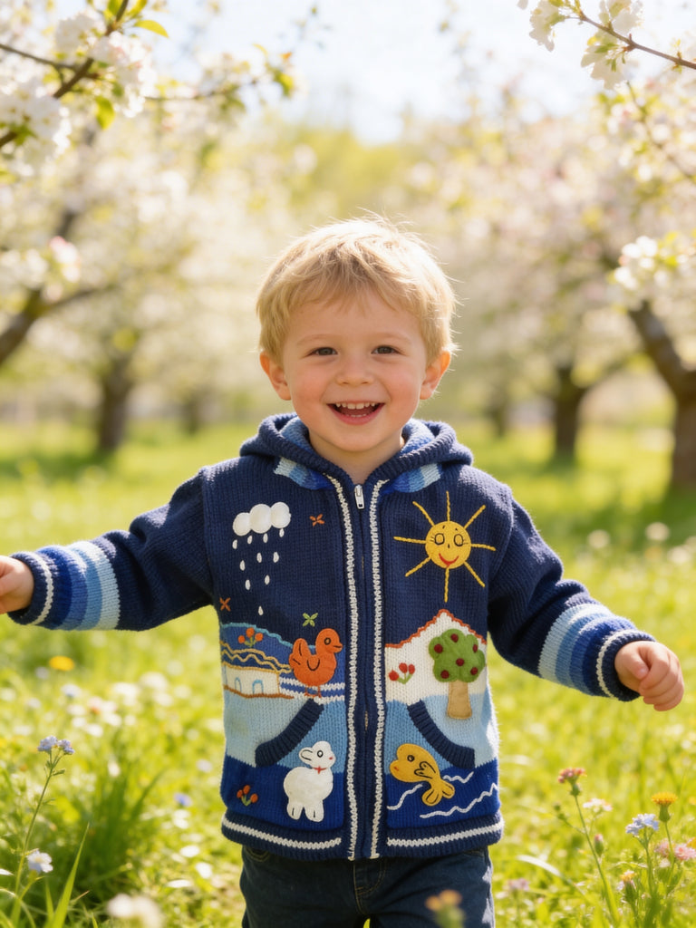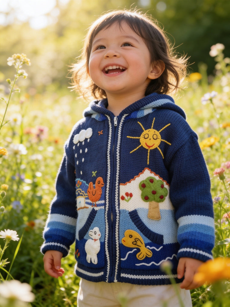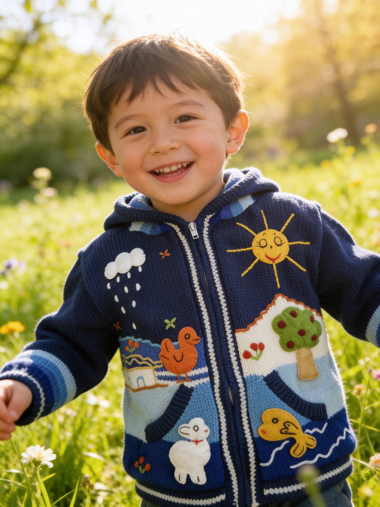 Hand-embroidered in the highlands of Peru, the Storybook Sweater brings to life whimsical scenes of animals, flowers, and forest magic — each one stitched by hand with vibrant detail and imagination. Soft, cozy, and full of personality, it’s a wearable tale your little one will love to live in.