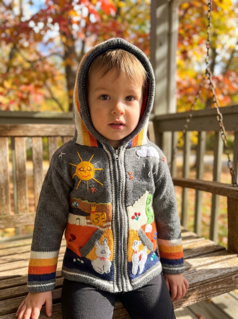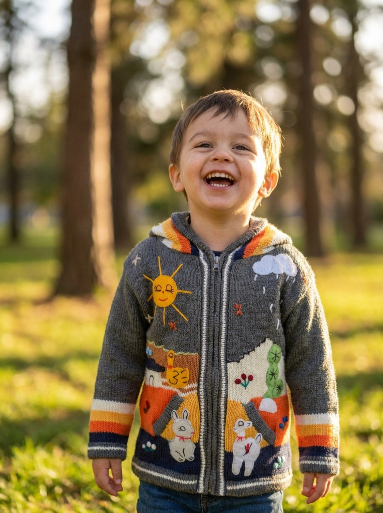 Hand-embroidered in the highlands of Peru, the Storybook Sweater brings to life whimsical scenes of animals, flowers, and forest magic — each one stitched by hand with vibrant detail and imagination. Soft, cozy, and full of personality, it’s a wearable tale your little one will love to live in.