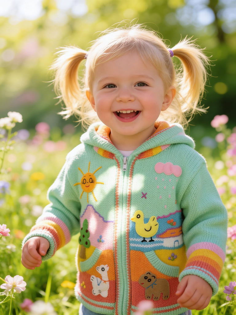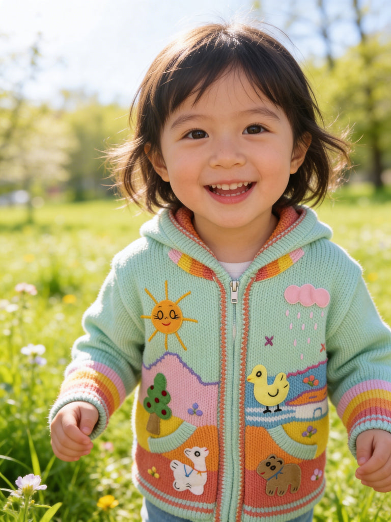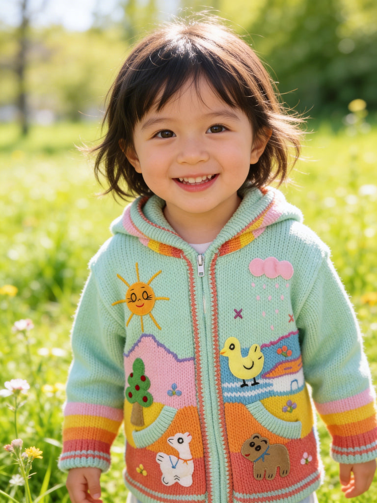 Hand-embroidered in the highlands of Peru, the Storybook Sweater brings to life whimsical scenes of animals, flowers, and forest magic — each one stitched by hand with vibrant detail and imagination. Soft, cozy, and full of personality, it’s a wearable tale your little one will love to live in.