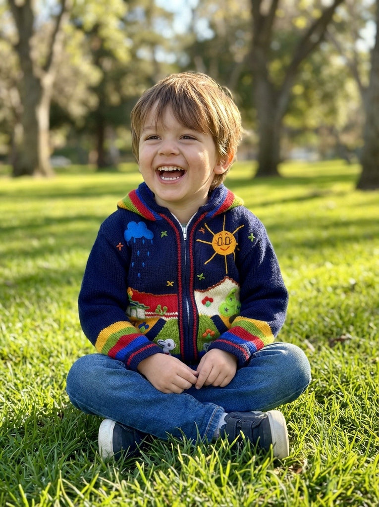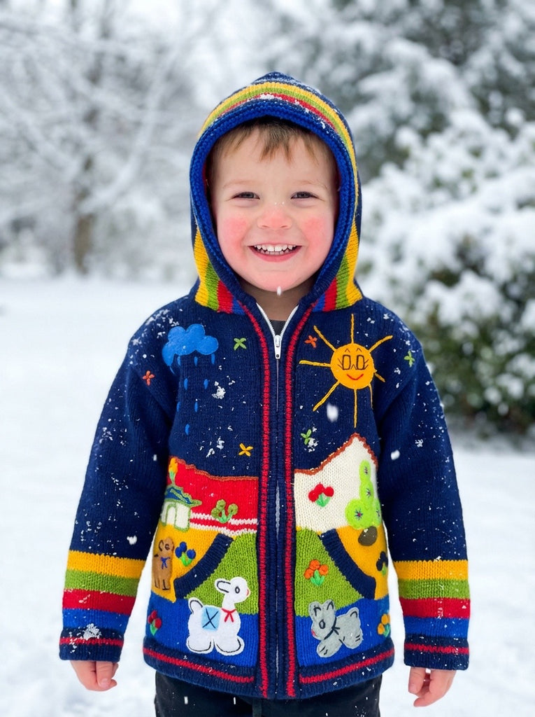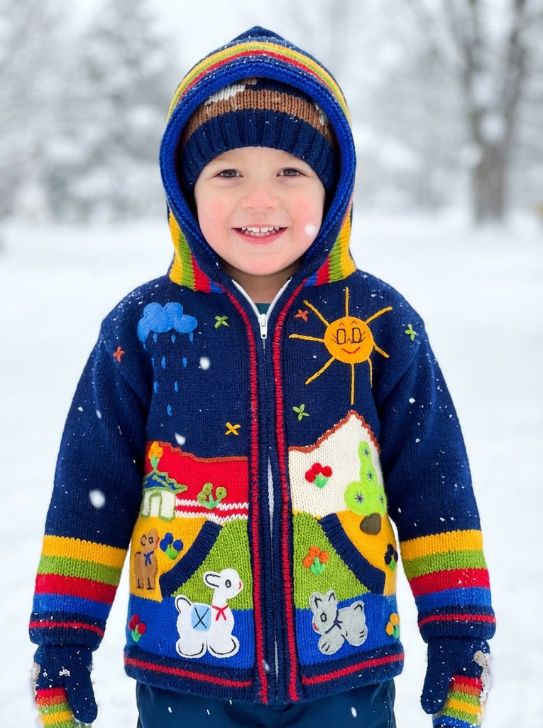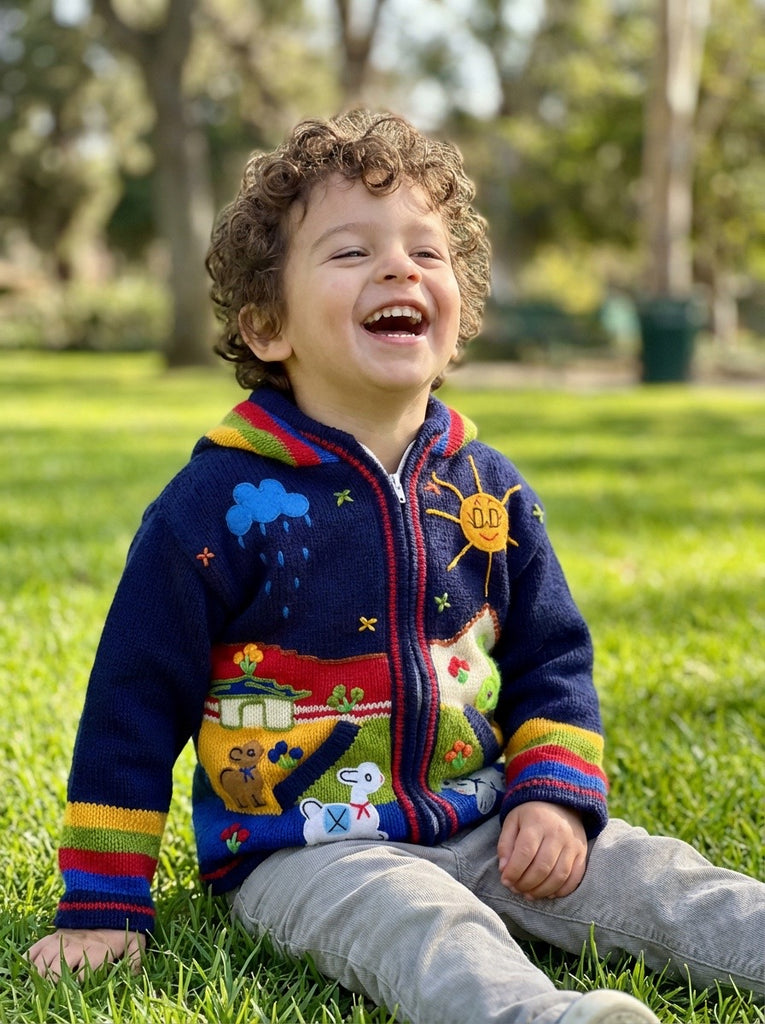 Hand-embroidered in the highlands of Peru, the Storybook Sweater brings to life whimsical scenes of animals, flowers, and forest magic — each one stitched by hand with vibrant detail and imagination. Soft, cozy, and full of personality, it’s a wearable tale your little one will love to live in.
