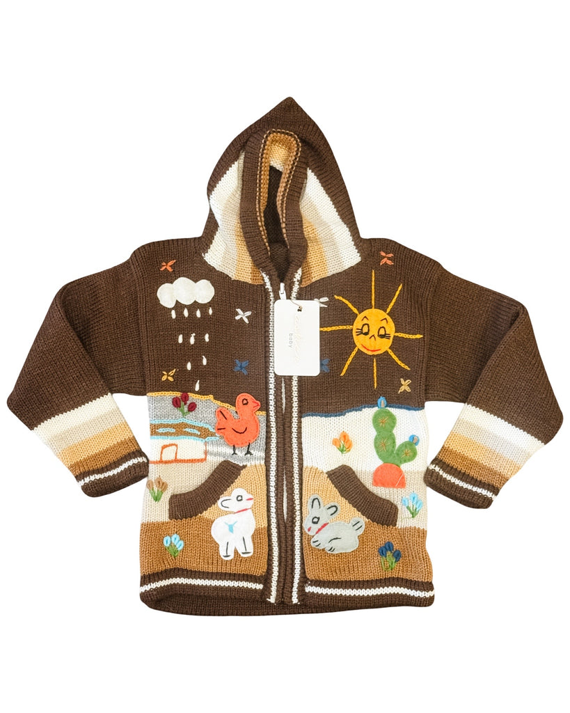 Hand-embroidered in the highlands of Peru, the Storybook Sweater brings to life whimsical scenes of animals, flowers, and forest magic — each one stitched by hand with vibrant detail and imagination. Soft, cozy, and full of personality, it’s a wearable tale your little one will love to live in.