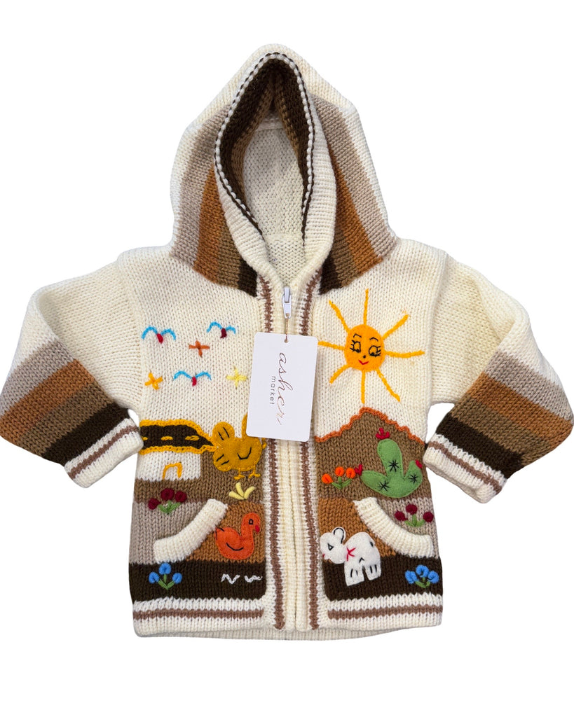 Hand-embroidered in the highlands of Peru, the Storybook Sweater brings to life whimsical scenes of animals, flowers, and forest magic — each one stitched by hand with vibrant detail and imagination. Soft, cozy, and full of personality, it’s a wearable tale your little one will love to live in.