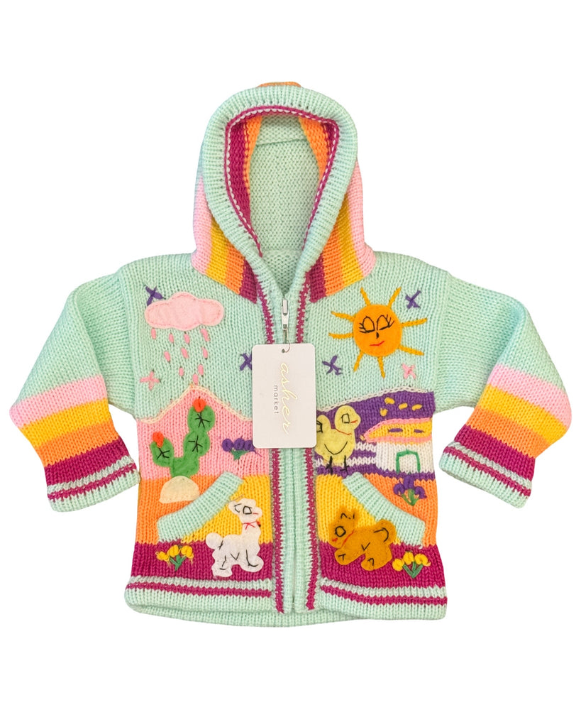 Hand-embroidered in the highlands of Peru, the Storybook Sweater brings to life whimsical scenes of animals, flowers, and forest magic — each one stitched by hand with vibrant detail and imagination. Soft, cozy, and full of personality, it’s a wearable tale your little one will love to live in.