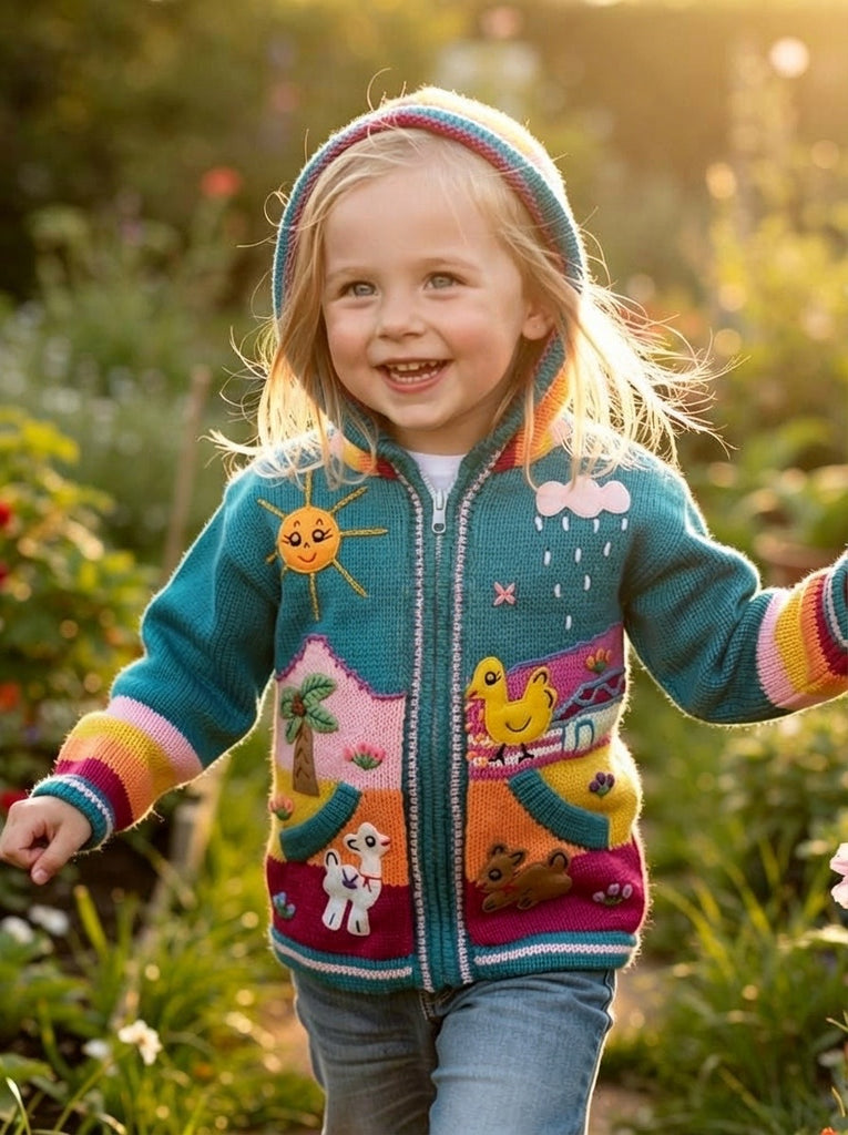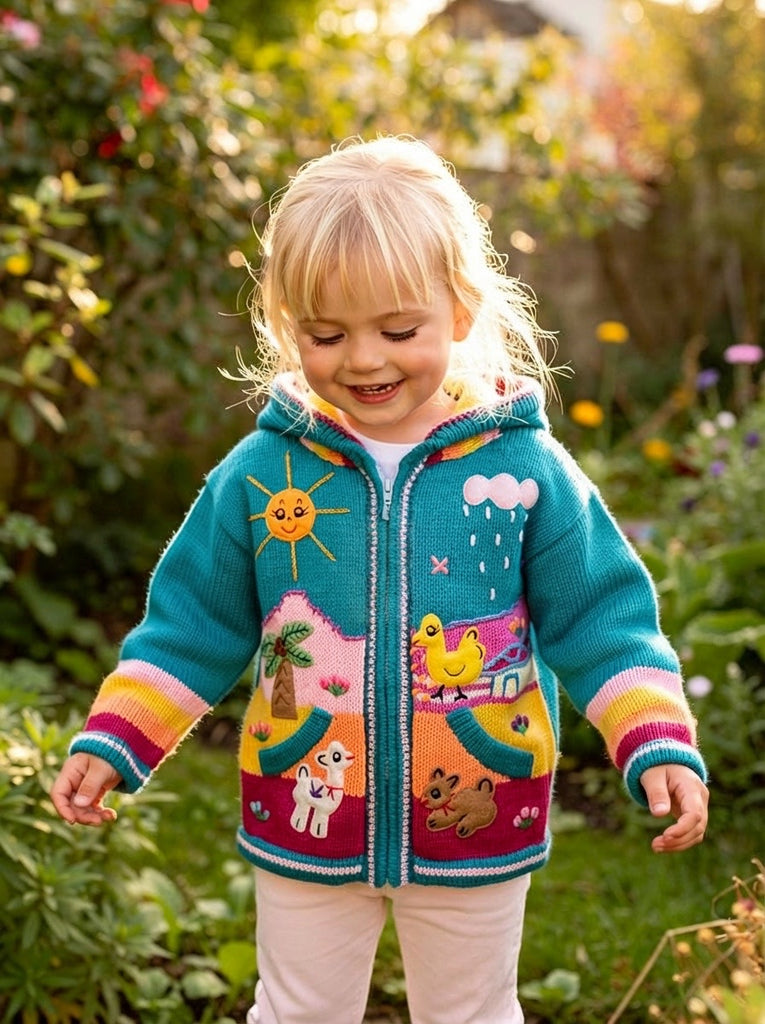 Hand-embroidered in the highlands of Peru, the Storybook Sweater brings to life whimsical scenes of animals, flowers, and forest magic — each one stitched by hand with vibrant detail and imagination. Soft, cozy, and full of personality, it’s a wearable tale your little one will love to live in.